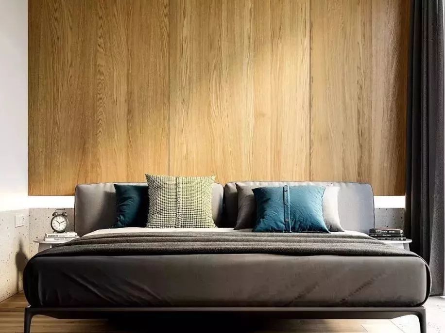 卧室的墙面除了贴壁纸之外,还可以用木饰面做装饰。木饰面相比刷漆来说给人更加柔和,并添加了时尚感。