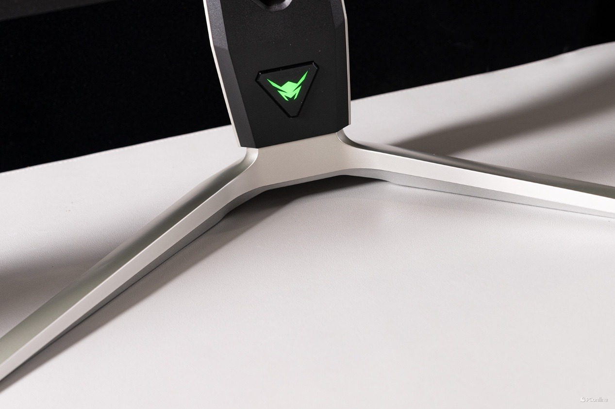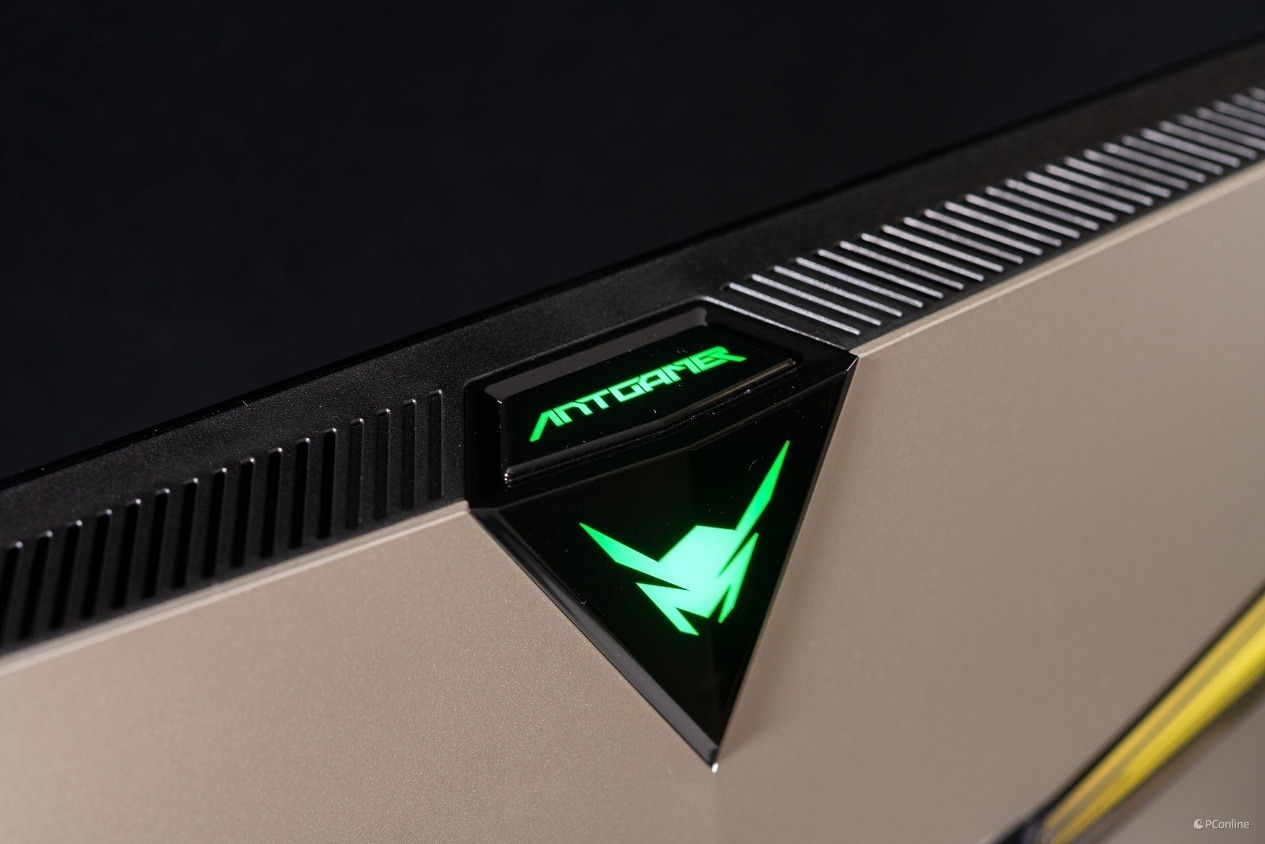 支架的下方还安排了一个蚂蚁电竞LOGO的灯牌,通电点亮后,别有一番风味。黑绿色的设计语言结合金属机身,既有十足的科技感,又不失个性化。