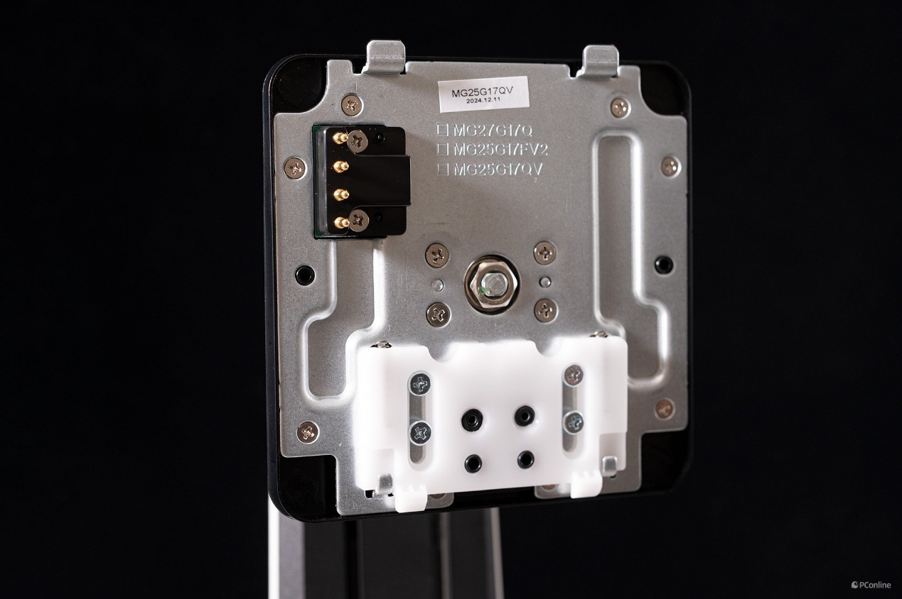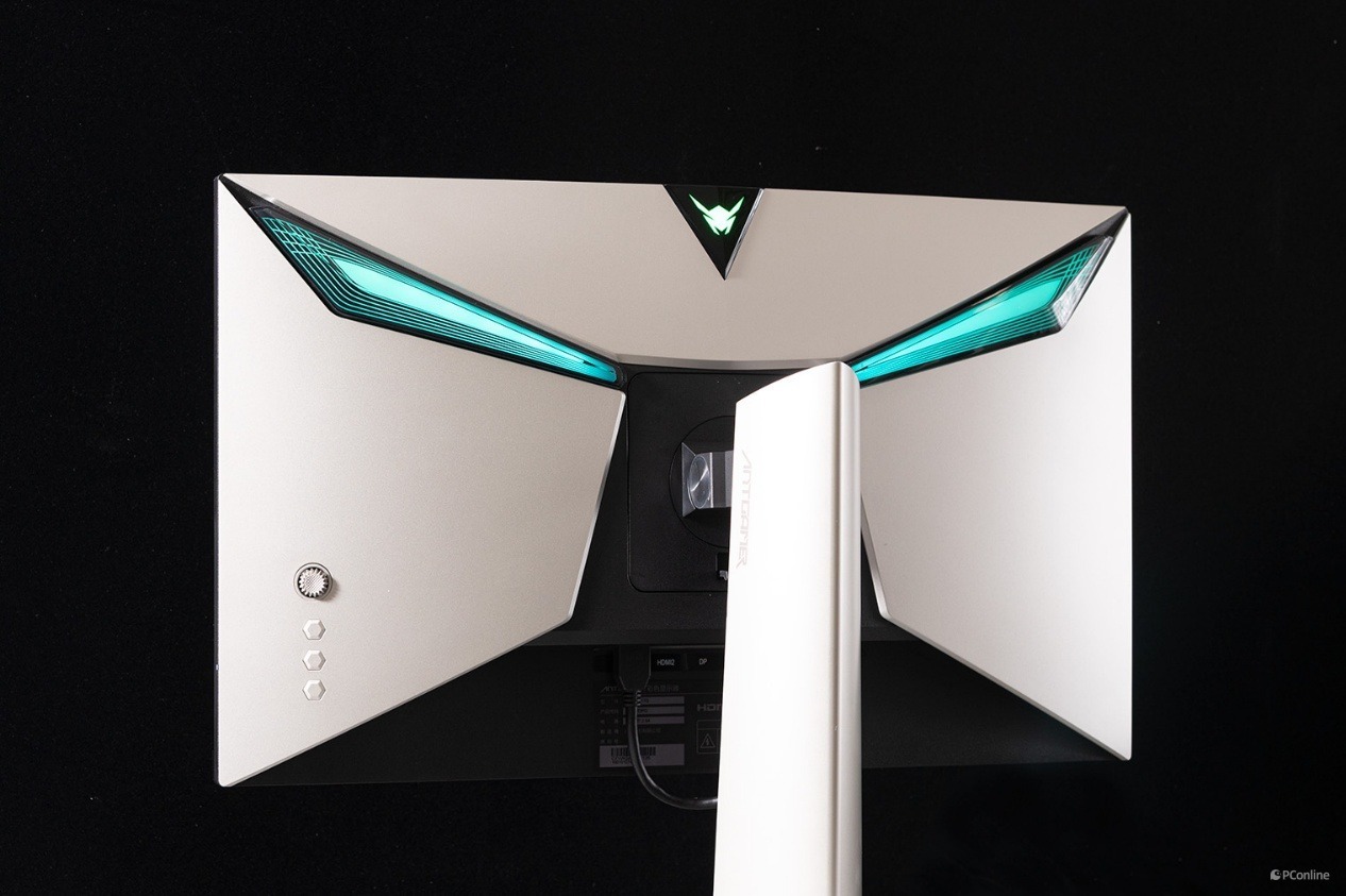 再看显示器的背部,其中最醒目的就是这两颗菱形的背灯了,据官方介绍,其设计灵感来自蚂蚁的眼睛。并且这个背灯支持色彩模式,用户可以根据个人喜好和使用场景,通过OSD菜单快速切换灯光效果。在暗光环境下,这些灯光效果更是能够营造出身临其境的氛围感,提升游戏沉浸感和视觉享受。