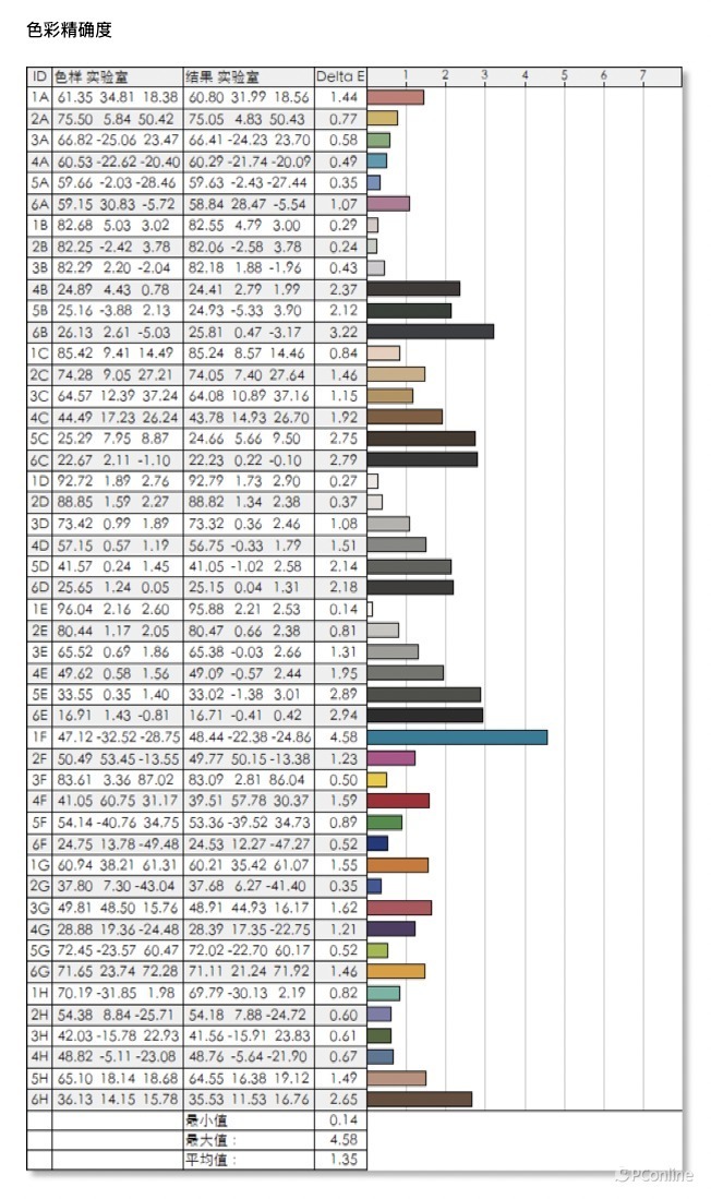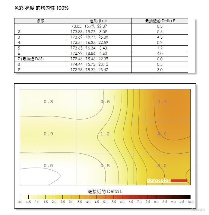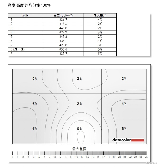 在面板均匀性方面,ANT253PQ搭载特调背光,在屏幕色彩和亮度均匀性上表现优秀。在全亮模式下,色彩的最大偏差仅有4.3,亮度最大偏差也仅有6%,在测试过的一众电竞显示器中,属于是独一档的存在。