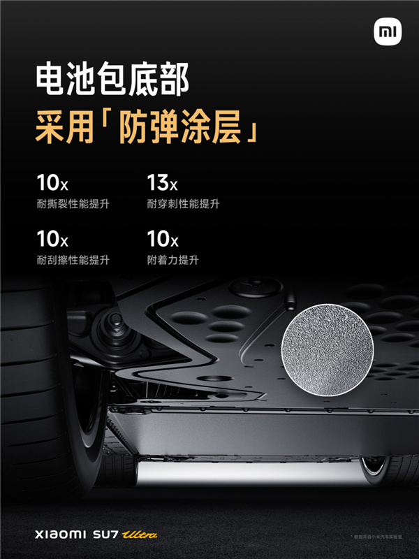 今天小米汽车官方进行了科普,小米SU7 Ultra的电池包底部采用了坦克装甲级防护的“防弹涂层”,可以有效的防止在托底等事故中、因异物冲击、剐蹭造成的电芯损伤。