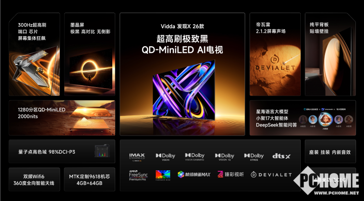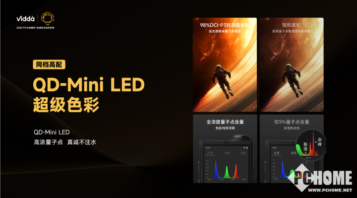 Vidda 发现 X 26 款不仅采用了 QD-Mini LED 技术,还使用了高浓度的 10 原量子点材料,色彩表现大幅提升,实现了真正的 98% DCI-P3 色域覆盖,成为同档电视色彩表现的佼佼者。在分区和亮度方面,它最高拥有 1280 分区和 2000 尼特超高亮度,远超同档水平。