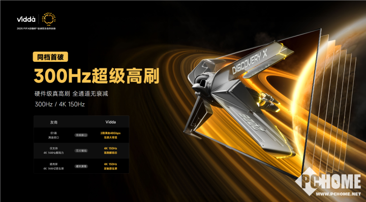Vidda 发现 X 26 款升级到同档首发的 4K 150Hz,同时具备 300Hz 高帧率模式,从 2 路满血 HDMI 2.1 接口、MTK 定制版 9618 芯片,到定制原生 4K 150Hz 屏,实现了全链路硬件高刷支持。与普通的 4K 120Hz 相比,它每秒能多显示 30 幅画面。在玩《黑神话悟空》这类游戏时,舞动金箍棒的动作每一下都清晰无比;观看球赛和赛车赛事,配合高刷插帧技术,能够清晰捕捉每一个动作细节,即便高速场景也不会出现卡顿、丢帧现象。