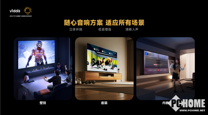 音响一直是 Vidda 的优势所在,发现 X 26 款不仅标配 2.1.2 多声道,内置低音炮,峰值功率更是达到 180W。对于大多数客厅而言,这样的音响配置已足够,无需再额外花费购买独立音响系统,十分划算。而且,该款电视音响设计合理,无论是挂墙、底座还是内嵌安装,都有定制音效方案,能营造出低音震撼、人声清晰的立体环绕声影院效果。