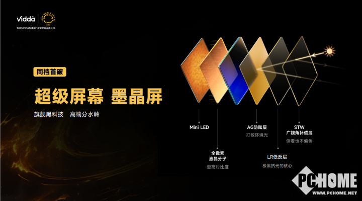Vidda 墨晶屏拥有三层黑科技。1.6% LR 低反射镀膜可将环境光反射降低到 2.6%,使画面更黑、更纯净,对比度更高,观感更立体;AG 防眩层通过磨砂涂层大幅减少反光和倒影,抗光能力提升 7 倍,这一配置以往常见于万元机型;STW 广视角补偿层则实现了 178° 全视角侧看不偏色,优于同档产品 30%。从瑞物实验室的对比评测来看,Vidda 发现 X 26 款的墨晶屏在新疆塔里木湖的极寒、极亮、极黑环境下,仍能保持画面清晰,暗部细节丰富。