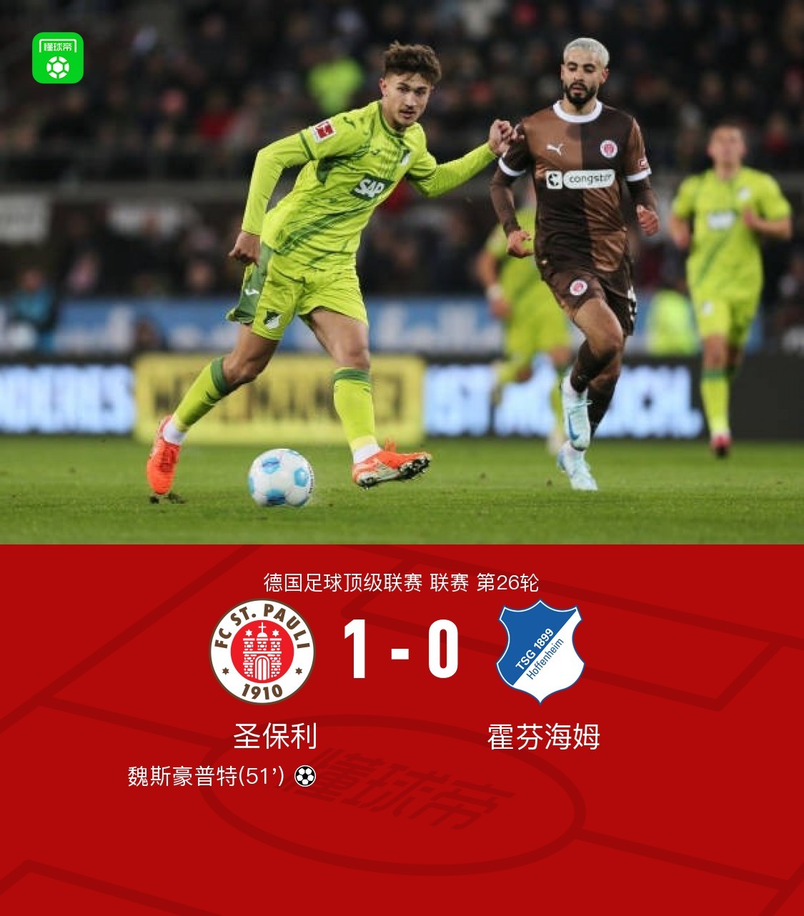 北京时间3月15日,德国足球顶级联赛第26轮,圣保利坐镇主场迎战霍芬海姆。比赛中,圣保利凭借魏斯豪普特的一记关键进球取得领先,这粒进球由菲利普-特罗伊送出助攻。最终,圣保利以1-0的比分战胜霍芬海姆,全取三分。