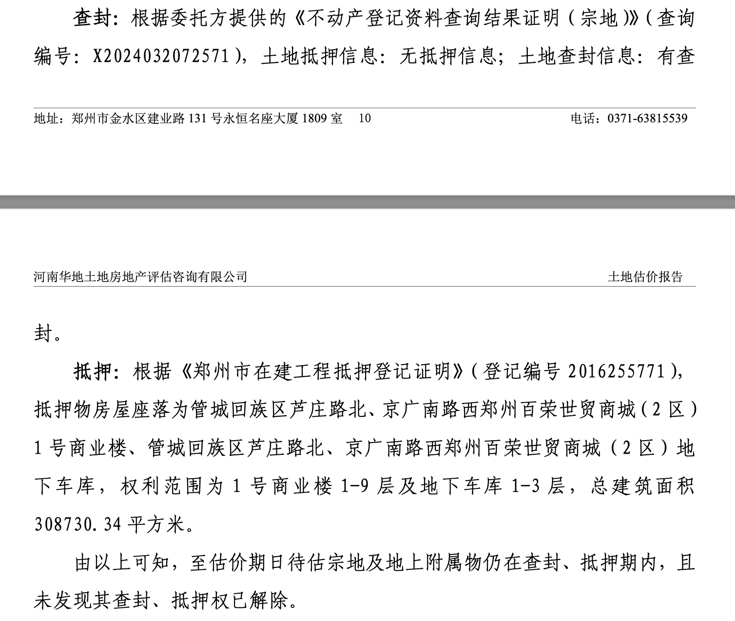 阿里司法拍卖网站所附的土地估价报告显示,此次拍卖源于交通银行股份有限公司河南省分行与金源百荣、百荣集团、郑州金源百荣商业管理有限公司等主体的借款合同纠纷一案,被执行标的资产。截至估价期日(2024年9月12日),C座仍在查封、抵押期内。