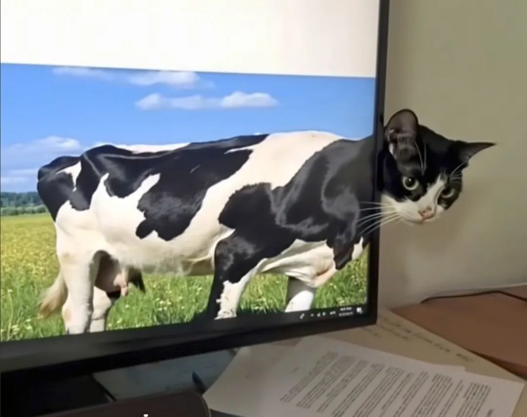 巧的是,猫咪身上黑白毛色,和奶牛照片的花纹完美对接,瞬间“合体”成一头超级逼真的“奶牛”,毫无违和感,就像定制的特效。