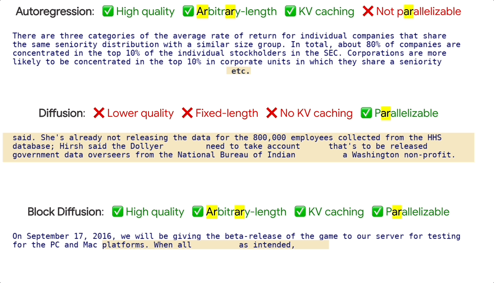 下图为 Block Diffusion 与自回归、扩散模型的生成效果对比: