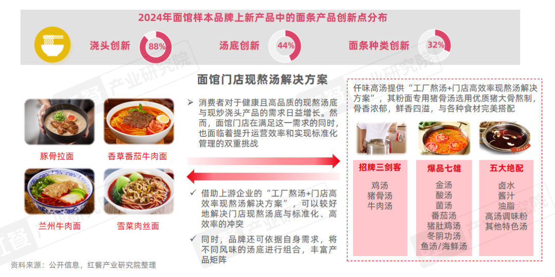 与此同时,部分上游企业也洞察到了汤底创新的需求,提供定制化、个性化的解决方案。例如,仟味高汤针对面馆品牌提供“工厂熬汤+门店高效率现熬汤解决方案”,同时依托“3大基础汤+7大风味汤+5大绝配特色调味品”的自由组合,面馆品牌可在确保产品标准化的同时进行差异化探索。