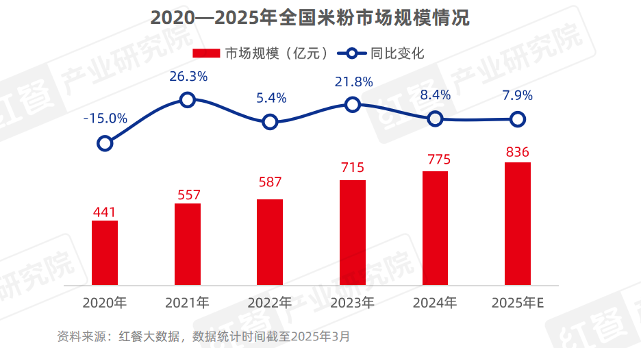 近年来,随着地方米粉的不断挖掘以及品牌连锁化程度的提升,米粉赛道持续扩容。据红餐大数据,截至2025年3月,全国米粉门店数超过34万家,比去年同期增加了4万家,同比增长13.3%。经红餐产业研究院测算,2024年米粉品类市场规模为775亿元,同比增长8.4%,预计2025年将继续增长至836亿元。