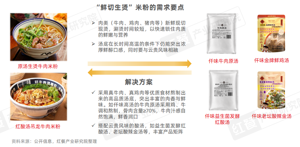 对于米粉品牌而言,自主研发适应“鲜切生烫”米粉的优质汤底并实现门店现熬现做并非易事。与专业调味料企业建立战略合作,成为品牌快速实现门店复制和产品创新的可行路径。以仟味高汤为例,其推出的牛肉原汤、金牌鲜鸡汤等系列产品能较好地契合生烫米线的汤底需求,而益生菌发酵红酸汤、老坛酸辣金汤等特色产品,则能精准还原云贵地区的独特风味,为品牌打造差异化产品矩阵提供有力支撑。
