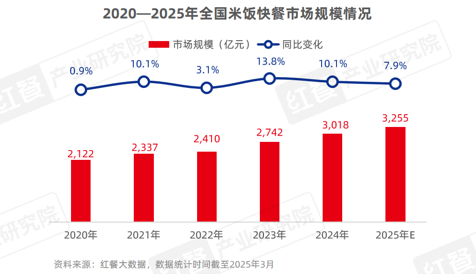 红餐大数据显示,截至2025年3月,全国米饭快餐门店数超过94万家,预计2025年市场规模将超过3,200亿元。
