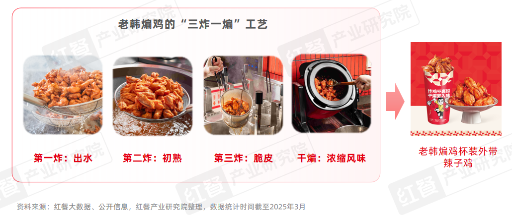 以老韩煸鸡为例,其巧妙地将川菜经典菜品干煸辣子鸡的做法融入到炸鸡赛道,研发出了“三炸一煸”的烹饪工艺,同时对传统辣子鸡的块状大小进行升级改良,其拳头产品干煸辣子鸡,凭借口口是肉、外焦里嫩、麻辣椒香的味觉体验,给消费者留下了深刻印象。