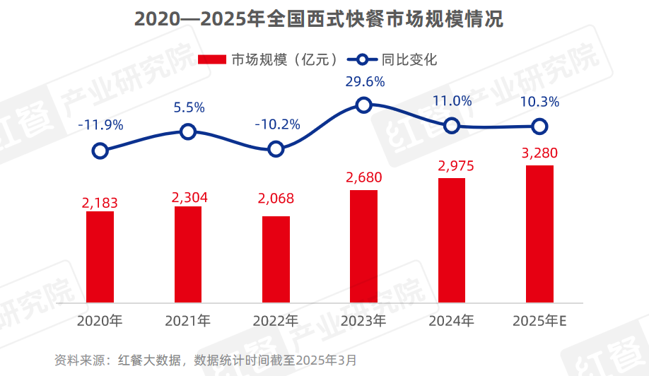 近年来,随着国际西式快餐巨头肯德基、麦当劳在我国市场的快速扩张,以及华莱士、塔斯汀、尊宝比萨等本土品牌的快速崛起,西式快餐赛道呈现出强劲的增长势头。据红餐产业研究院预测,2025年全国西式快餐市场规模将达到3,280亿元,同比增长10.3%。