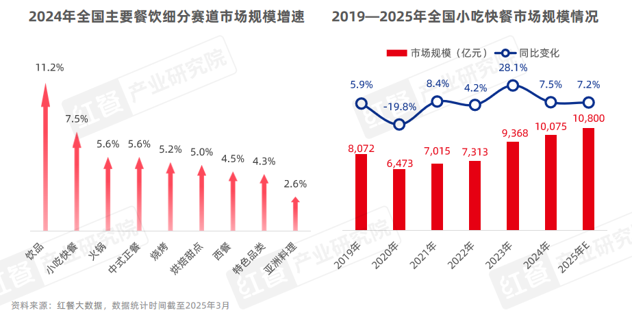 近年来,凭借刚需属性强、受众基础广的优势,小吃快餐实现了持续高速增长,成为餐饮行业最具活力的细分赛道之一。红餐大数据显示,2024年小吃快餐市场规模以7.5%的增速居全国餐饮各细分赛道前列。截至2025年3月,全国小吃快餐总门店数已超过了360万家,预计2025年小吃快餐市场规模将增长至1.08万亿元。