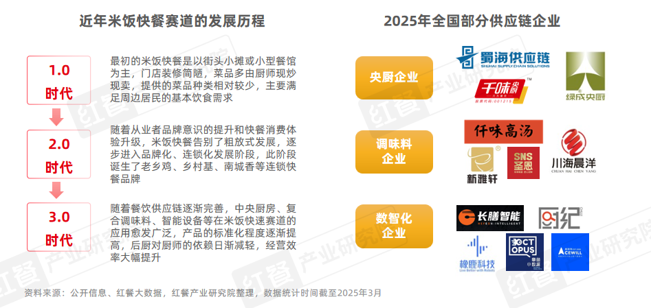 这些米饭快餐连锁品牌的快速发展离不开中央厨房、调味料企业、数智化企业、冷链物流等上游供应链的支持,尤其是复合调味料与智能设备企业。在明厨亮档日渐成为餐饮新时尚的背景下,复合调味料为米饭快餐品牌提供了标准化的解决方案;智能设备则通过自动化、智能化的操作,降低了后厨对厨师技术水平的依赖,提高出餐效率和稳定性。