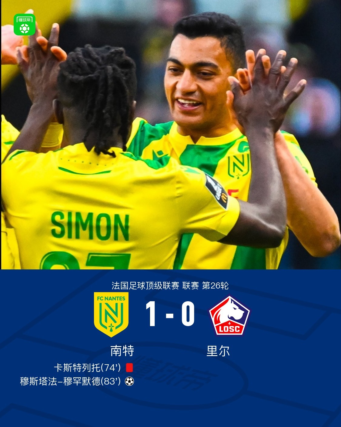第83分钟,西蒙左路底线附近传中,穆斯塔法头球破门,南特1-0