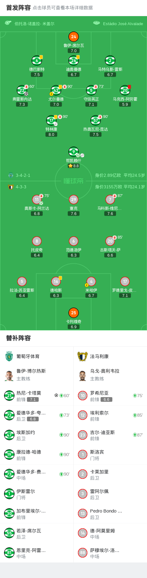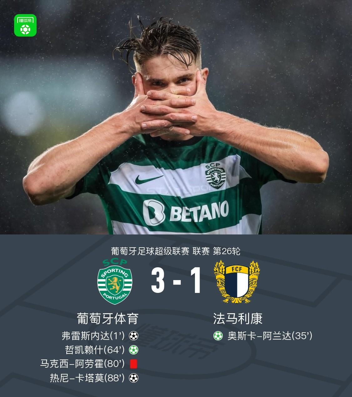在北京时间3月16日进行的葡萄牙足球超级联赛第26轮比赛中,葡萄牙体育坐镇主场迎战法马利康。比赛开始后,葡萄牙体育迅速取得领先,弗雷斯内达接队友特林康的助攻成功破门。随后,法马利康通过奥斯卡-阿兰达罚入的点球将比分扳平。然而,葡萄牙体育并未停下进攻的步伐,哲凯赖什同样通过点球机会为球队再度超出比分。比赛中段,葡萄牙体育的一名球员被红牌罚下,但这一变故并未影响到他们的攻势。临近比赛结束时,哲凯赖什送出助攻,热尼-卡塔莫打入一球,为主队锁定胜局。最终,葡萄牙体育以3-1战胜法马利康,全取三分。