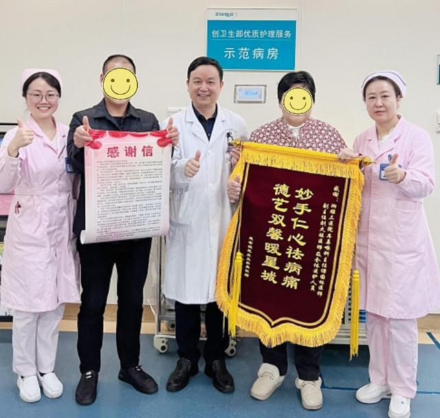 3月14日下午,在中南大学湘雅三医院耳鼻咽喉头颈外科病房,姚阿姨和她的儿子手里紧紧攥着一卷红绸和一封感谢信出现在护士站前,眼角虽泛着泪光,却笑得像个孩子。