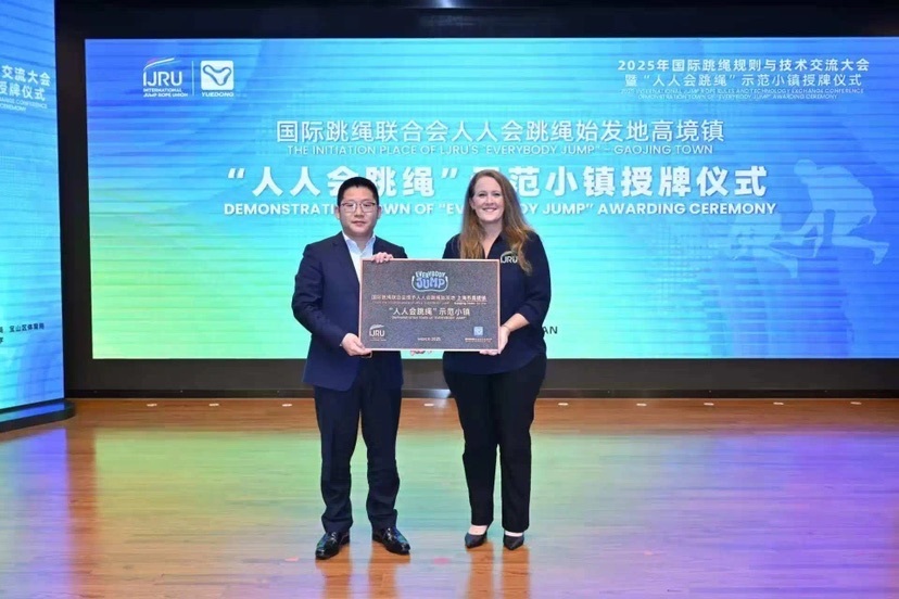 3月15日上午,在上海市学生活动管理中心、宝山区教育局、区体育局、高境镇人民政府、市毽球跳绳协会及跳绳运动代表的共同见证下,2025年国际跳绳规则与技术交流大会暨“人人会跳绳”示范小镇授牌仪式在高境科创实验小学报告厅举行。国际跳绳联合会技术官员、理事Kirralee Jane Larkin女士向高境镇授予“人人会跳绳”示范小镇牌匾,标志着高境镇作为全球跳绳运动推广标杆的示范地位进一步得到国际认可。