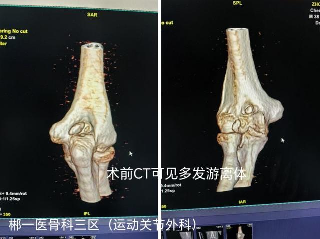 患者李先生,38岁,是一名运动爱好者,平素喜欢打篮球,1个月前无明显诱因出现右肘关节疼痛伴活动受限,保守治疗效果不佳,症状逐渐加重,甚至影响日常生活。门诊以“右肘关节游离体”收住入院。