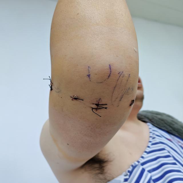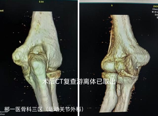 3月11日,何骁主任医师团队为李先生实施了肘关节镜下游离体取出术。术中,仅通过几个不到1厘米的小切口,医生便将关节镜镜头和手术器械置入肘关节内,在清晰的视野下,精准地找到了游离体并将其取出,同时对关节腔进行了清理和探查,手术过程顺利,出血少。术后复查肘关节CT,游离体已取出,无神经血管损伤、无肘关节副韧带损伤、无切口愈合不良等并发症发生。