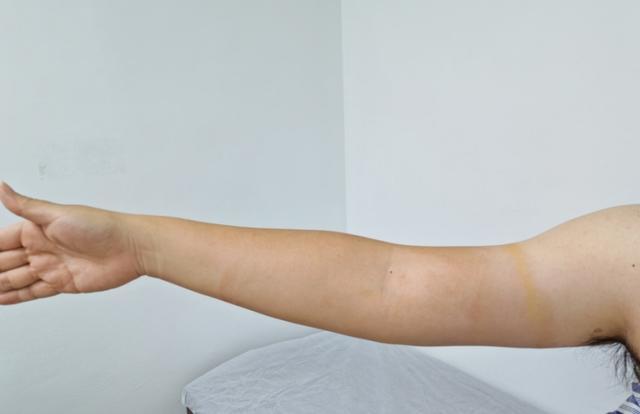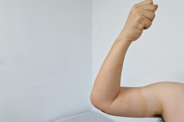 ▲术后第2天,患者右肘关节伸直、屈曲,活动自如