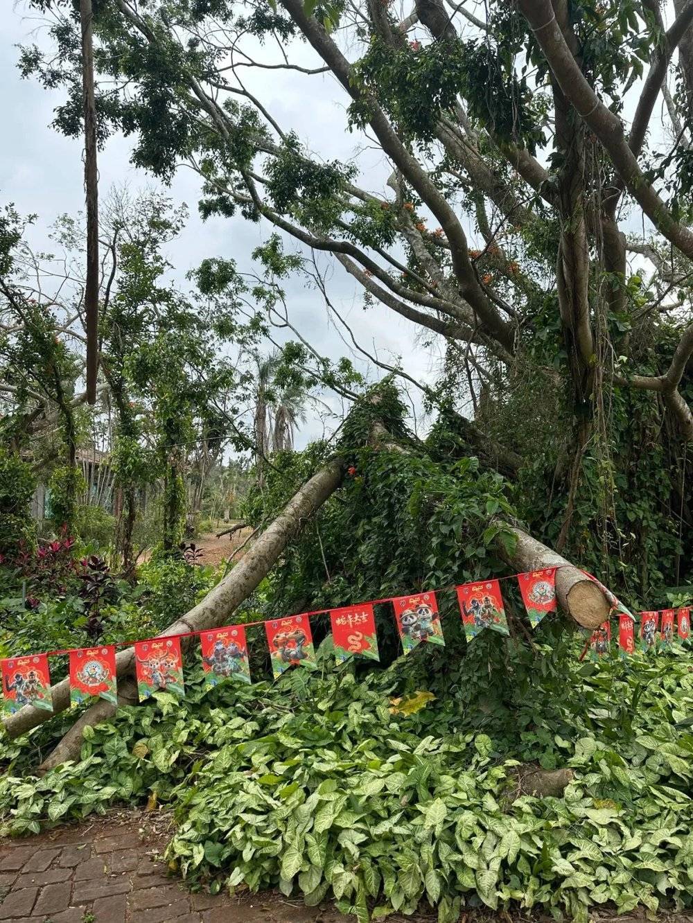 从牌坊到检票口,沿路的凤凰木交错倒伏,一片狼藉,车没办法开进去。从家里赶来的海野人只能把车停在路口,攀、爬、钻,手脚并用地缓慢靠近办公区。