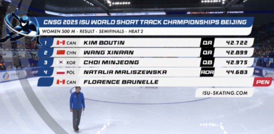 由于加拿大选手被判犯规,王欣然以42秒899的成绩顺位小组第二,成功晋级决赛!