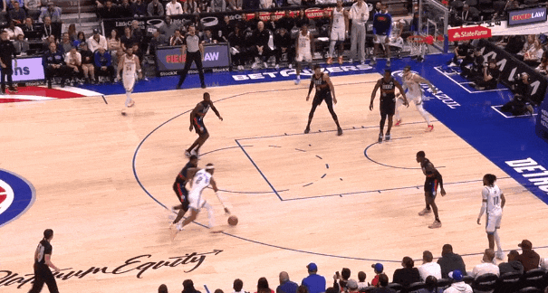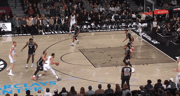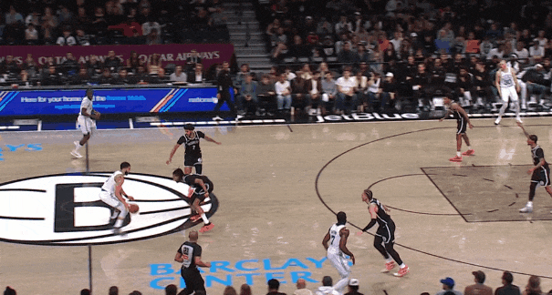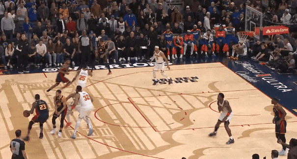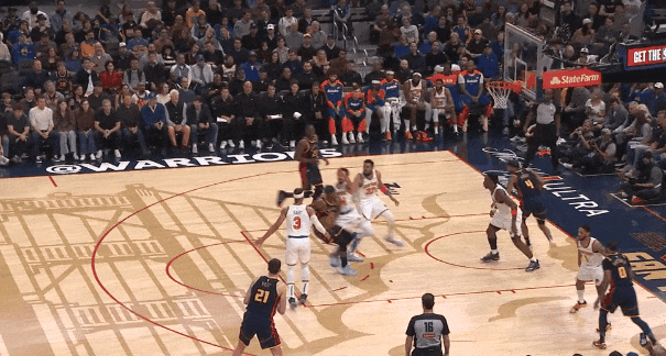 ——这一球最妙的是,库里给追梦掩护,同时穆迪内切带走大桥,又外切左底角;大桥一定记得穆迪的底角三分,跟着走,于是追梦上空篮畅通无阻。
