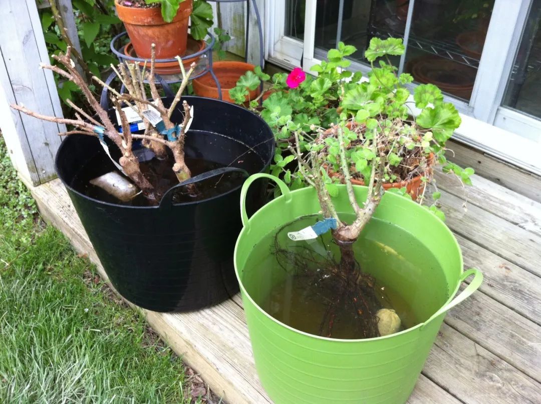 健壮的裸根月季买回家之后,就要用杀菌溶液浸泡,比如用多菌灵溶液,兑水1:1500,枝条放在溶液里浸泡10分钟,注意要将整个植株放在溶液里浸泡。