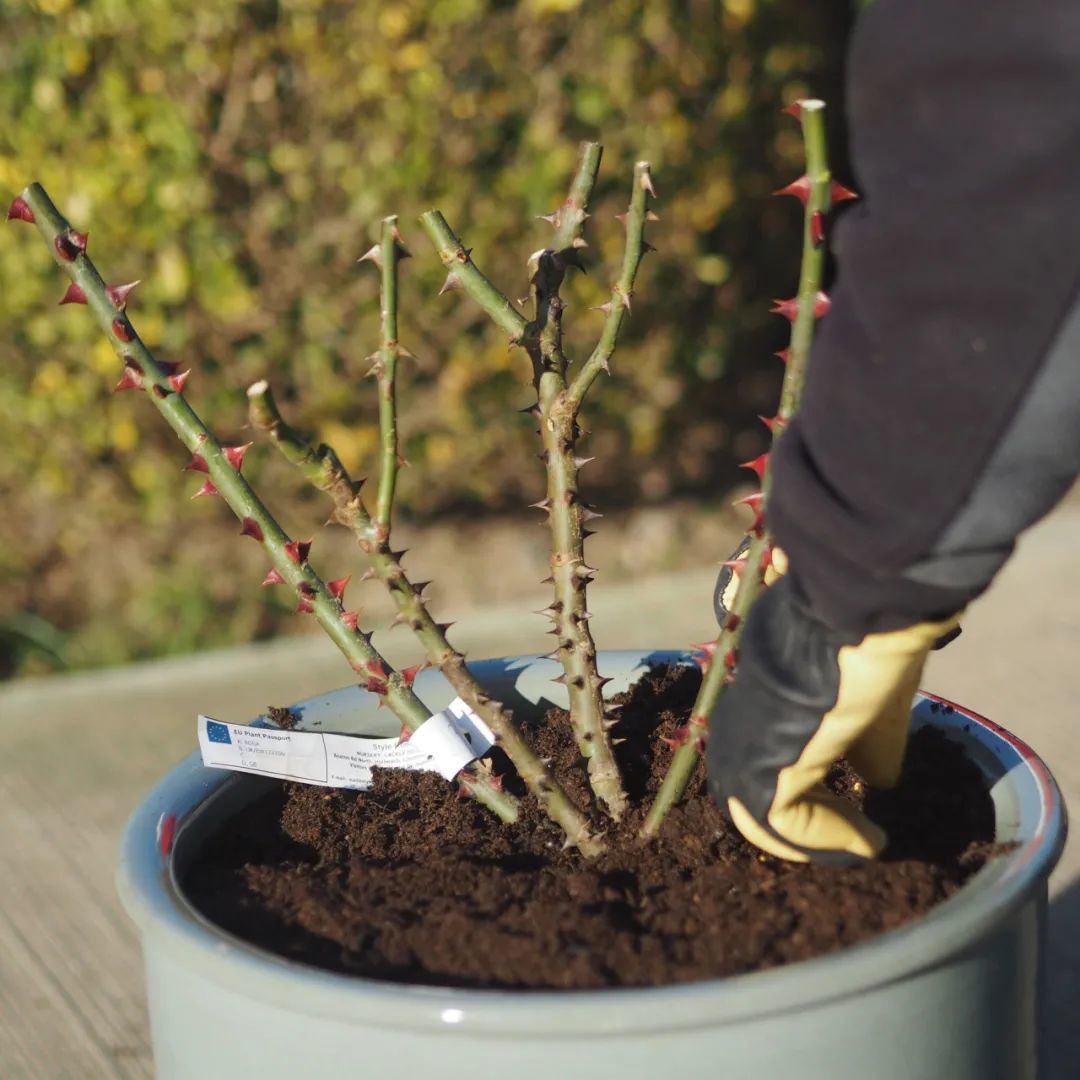 盆栽种好裸根月季之后,就可以稍微压一下土壤,可以轻提一下月季的根茎,就是让它的根系和土壤的紧密相连,根部和土壤也就融合得更好一些。