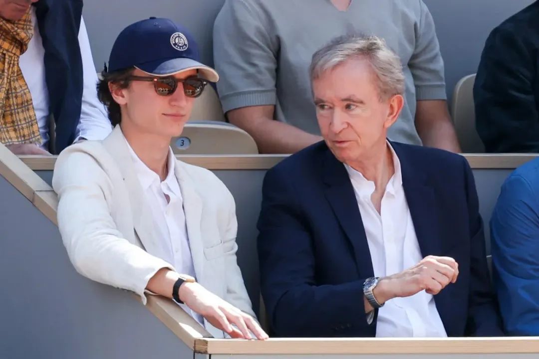 Frédéric Arnault与其父LVMH集团总裁兼首席执行官Bernard Arnault在去年6月的2024年法国网球公开赛看台上