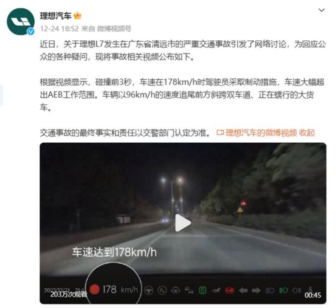 前年年底,一台理想L7汽车在广东清远的国道上发生惨烈车祸,追尾大卡车后A柱断裂,导致2死1伤,事后厂家公布了当时的行车记录仪视频,事发前车主居然飙到了178公里/小时,这款车甚至都不是以性能为卖点的产品,属于标准的奶爸车,照样被玩出了速度与激情。