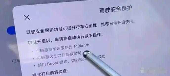 新车的极速被限制在了140公里/小时,且不能输出最大动力,Boost模式、弹射模式等等跟飙车有关的功能,也全部被禁用。车主需要平稳驾驶300公里的路程,熟悉车辆性能之后,才可以解除掉新手保护。