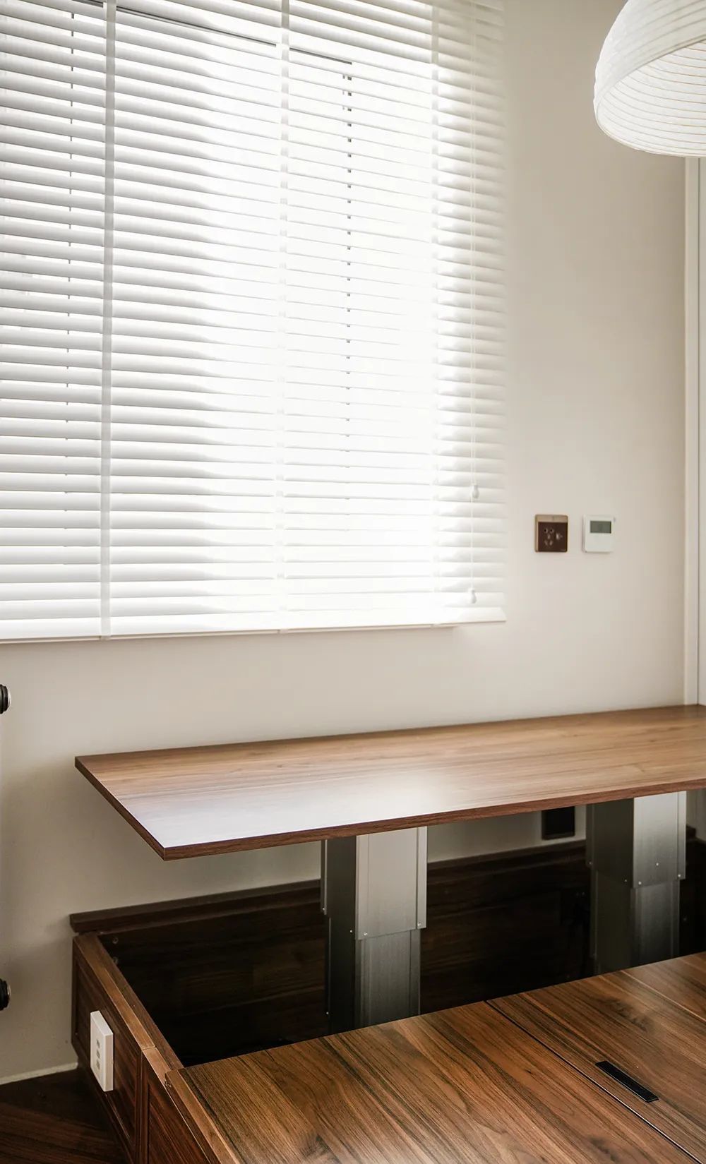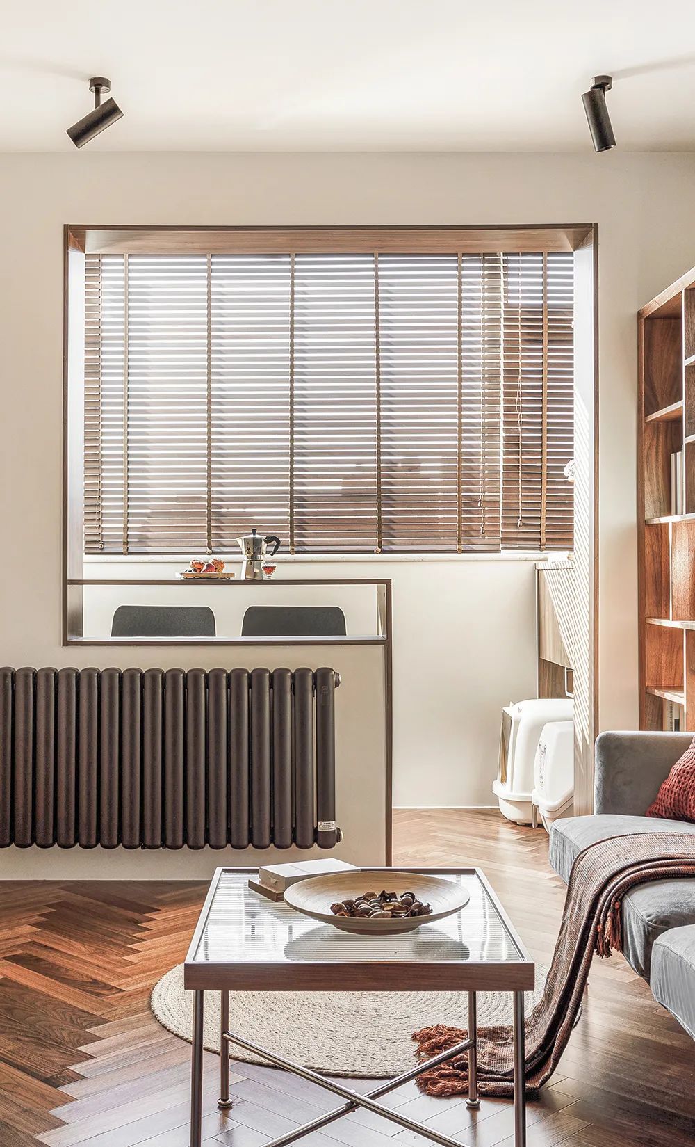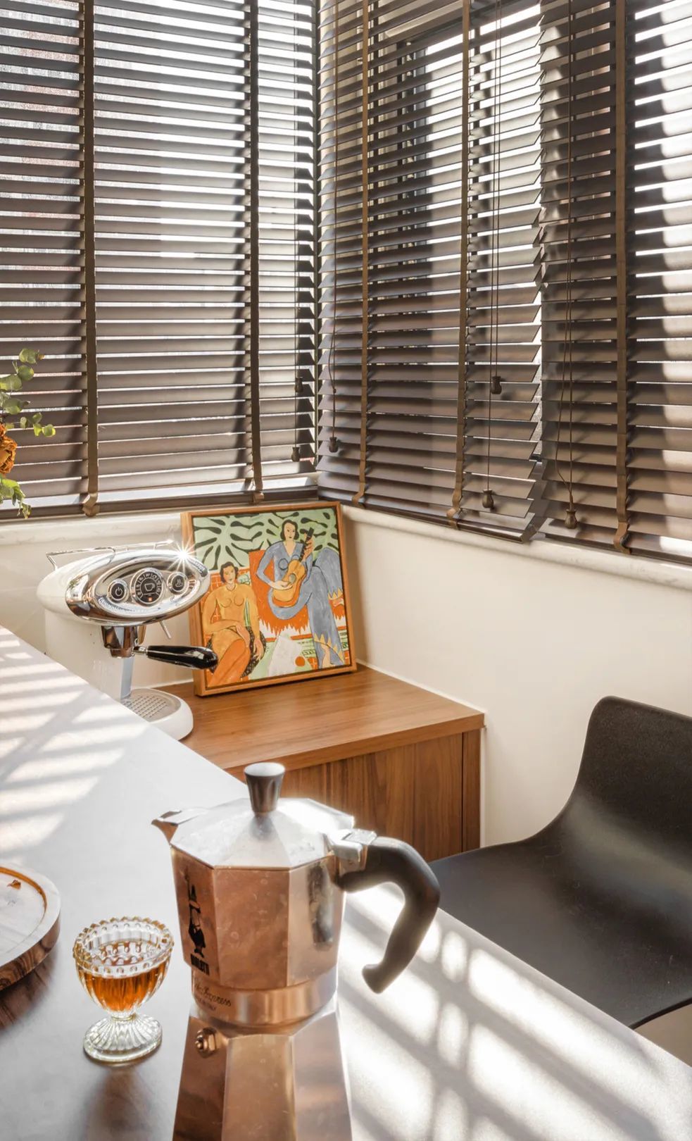 小阳台虽然面积小,但胜在三面环窗,安装木质百叶帘,保证室内隐私的同时不影响采光。屋主在这个区域放置了咖啡机,满足简单的休息和用餐。