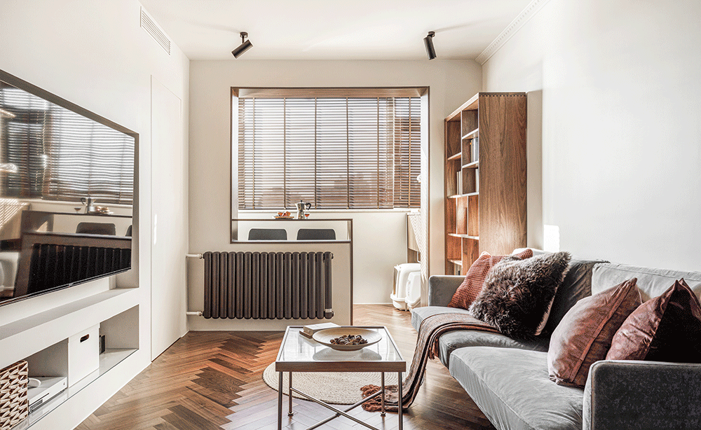 电视墙储物区进深约45公分,搭配收纳配件,可代替电视柜使用。