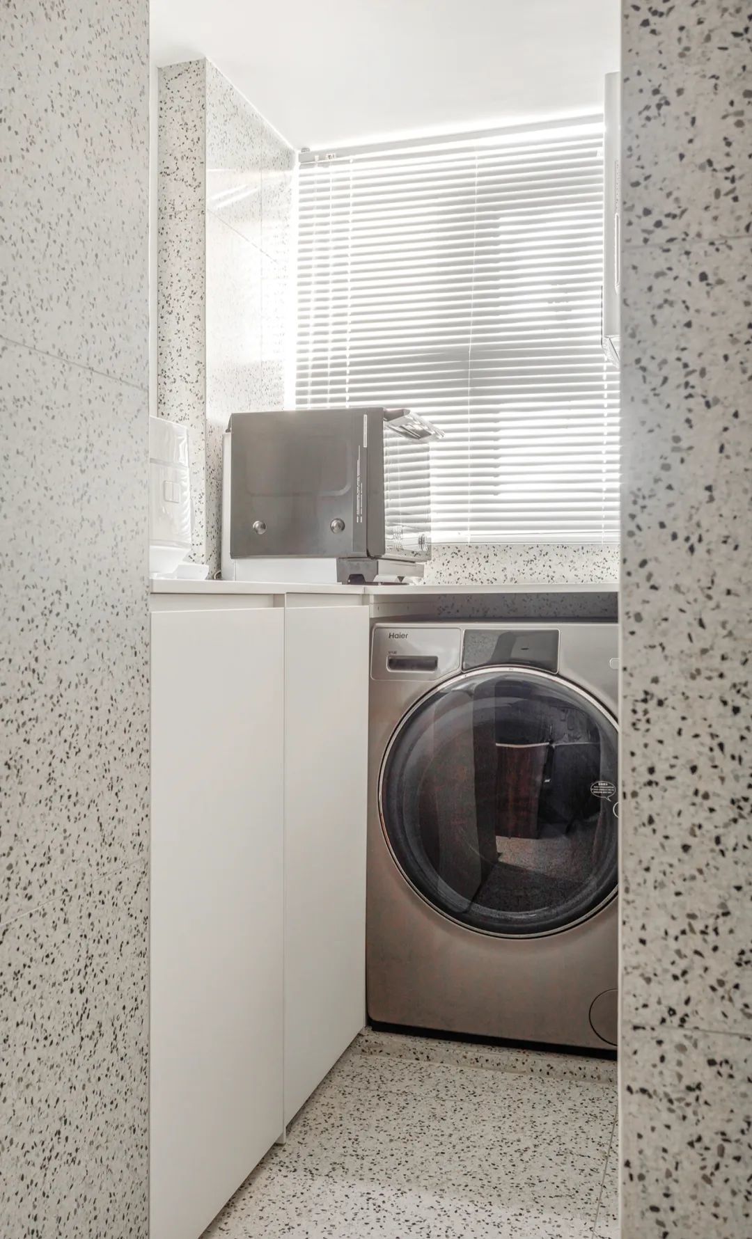 临近厨房的设备小阳台被改成了洗衣房,台面则作为厨房操作台的功能延伸,放置常用小家电。