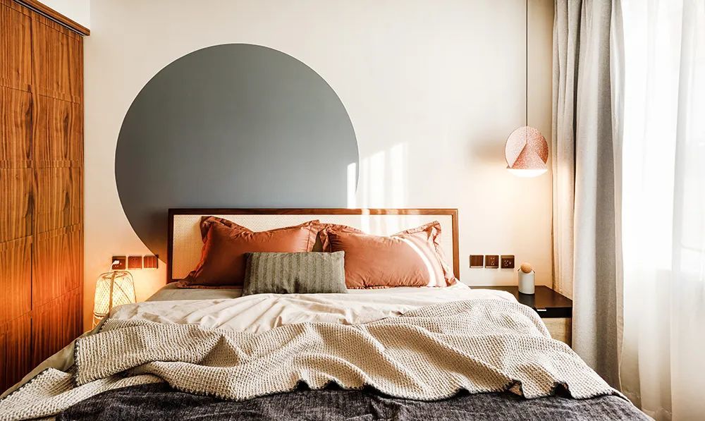 主卧面积有限,双人床+衣柜这些基础功能家具入场后,房间基本已经满了,设计师通过墙面色块的使用,为空间增加了一些变化。