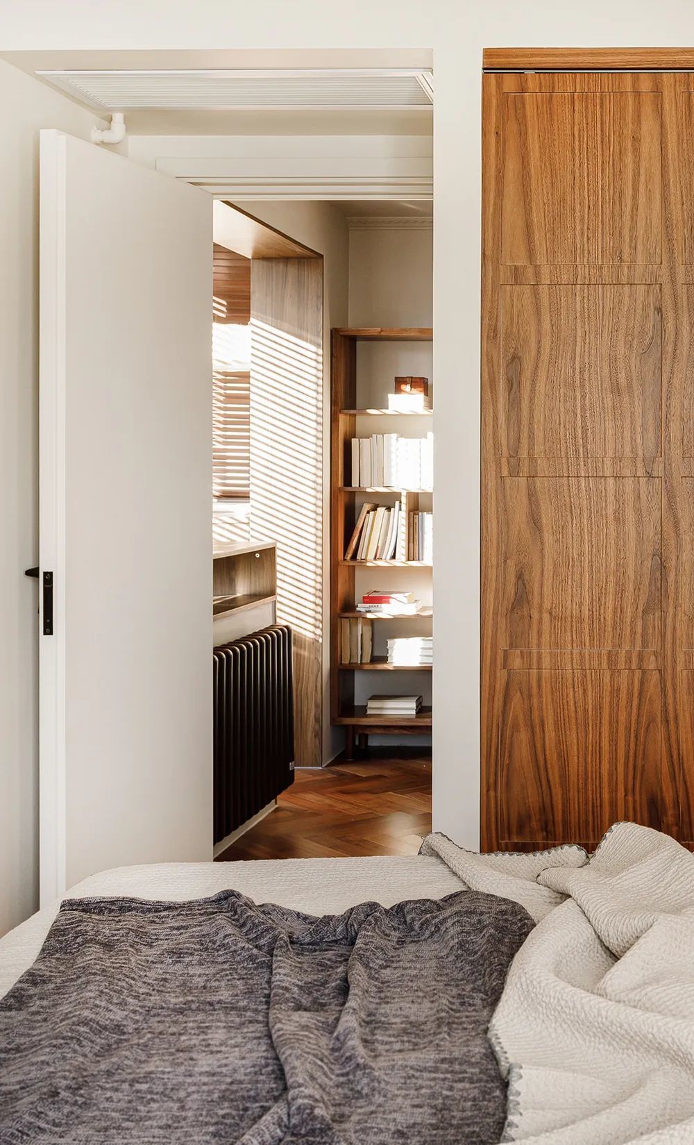 卧室视角看客厅,原木色衣柜与客厅在材质上相呼应,床头色块的运用让大面积的木纹不显老气。