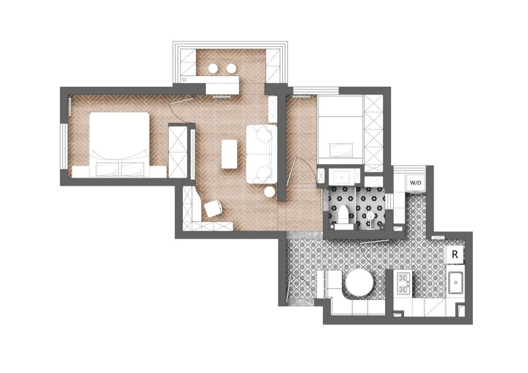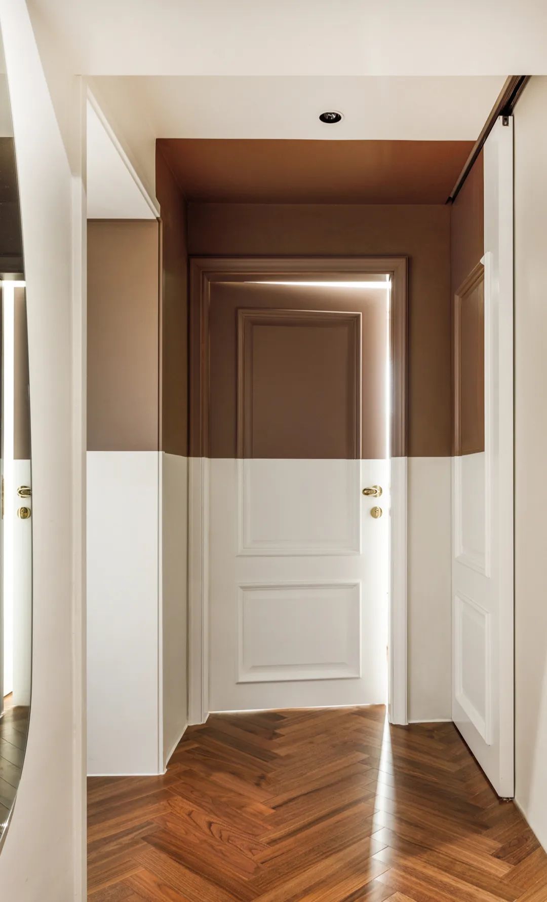 入户门正对进入卧室的走廊,地面的材质拼接提醒着进入室内的功能切换,拼色从门洞一直延伸至客厅门洞内,打破了空间的视觉限度,使其有一定的延展性。
