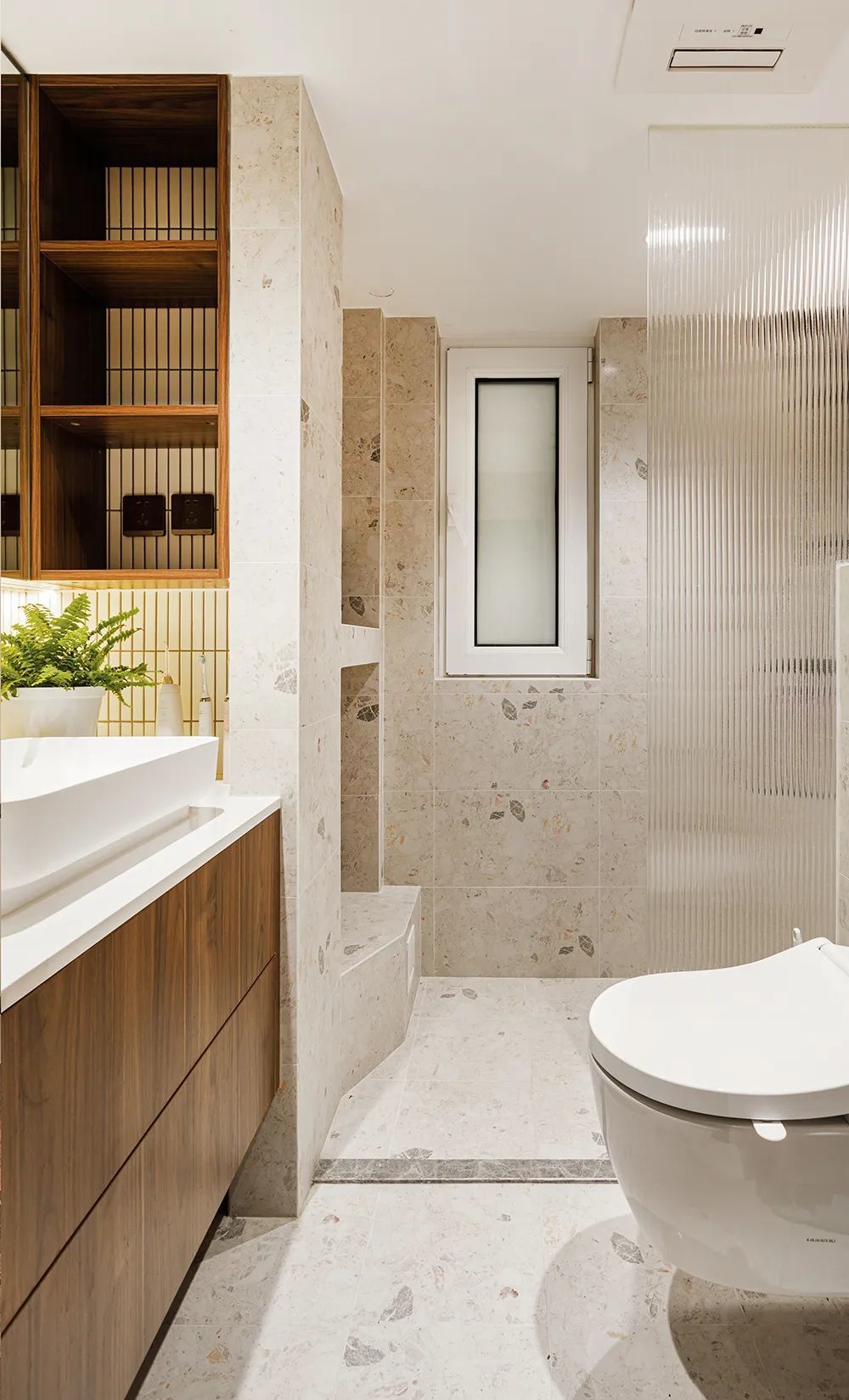 原卫生间极其狭小,长宽跨度有限,改动时,设计师借用了部分次卧面积,宽裕出来的空间刚好用来设置洗手台和镜柜,以及侧面的储物格。空间内也因此有了独立淋浴区,墙面设置储物壁龛,该有的功能一个不能少。