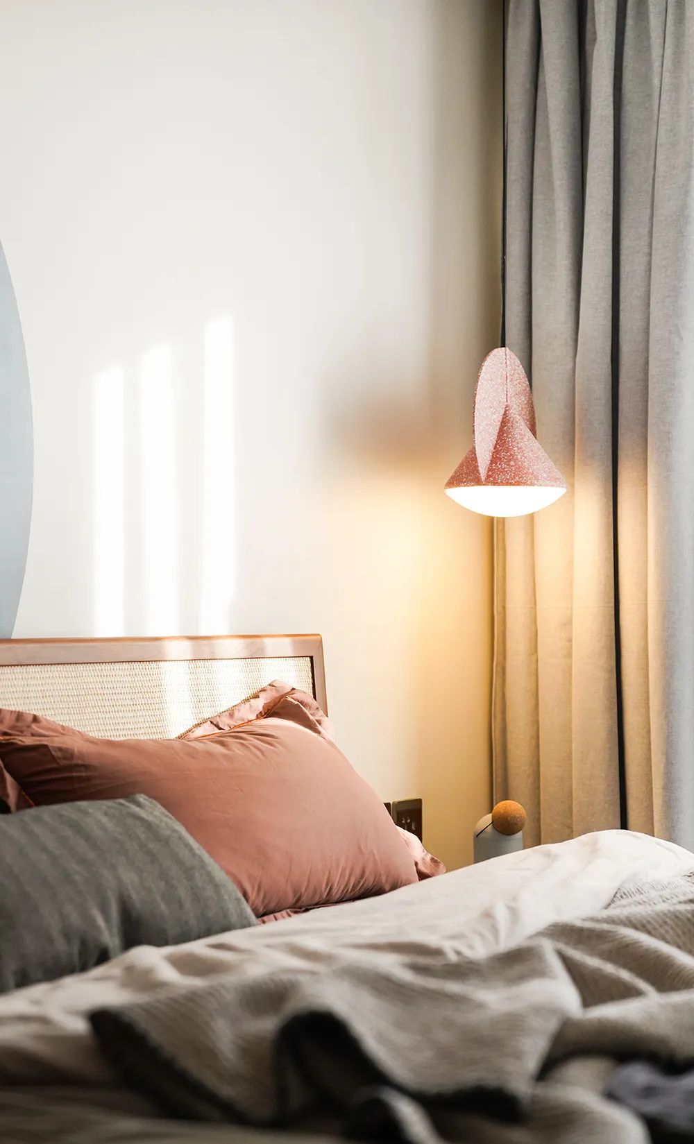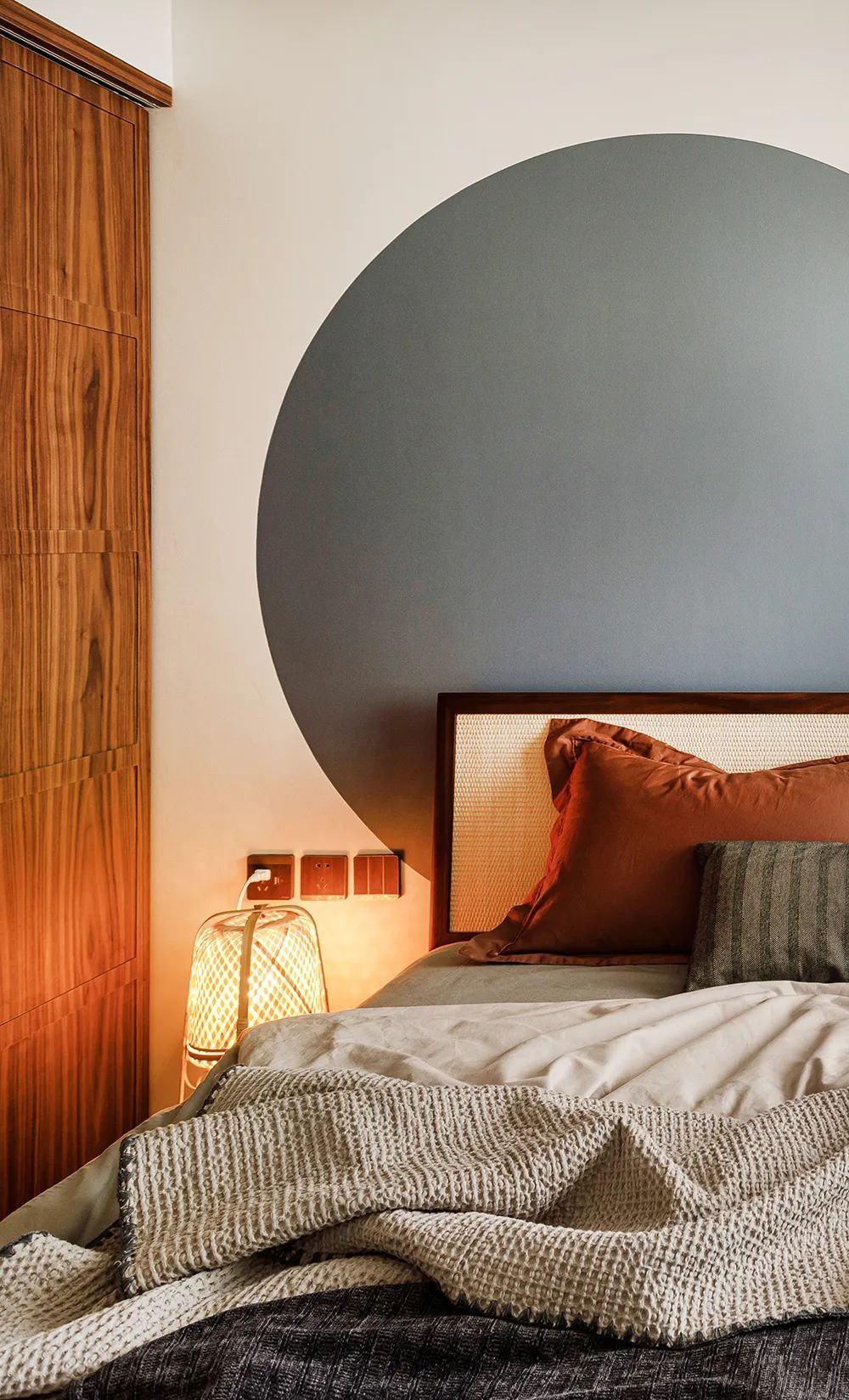 卧室整体的配色温暖、柔和,夜晚灯光亮起,莫明就会让人有种归属感。藤编床搭配不对称床头设计,为简约小卧室增添一份灵动。