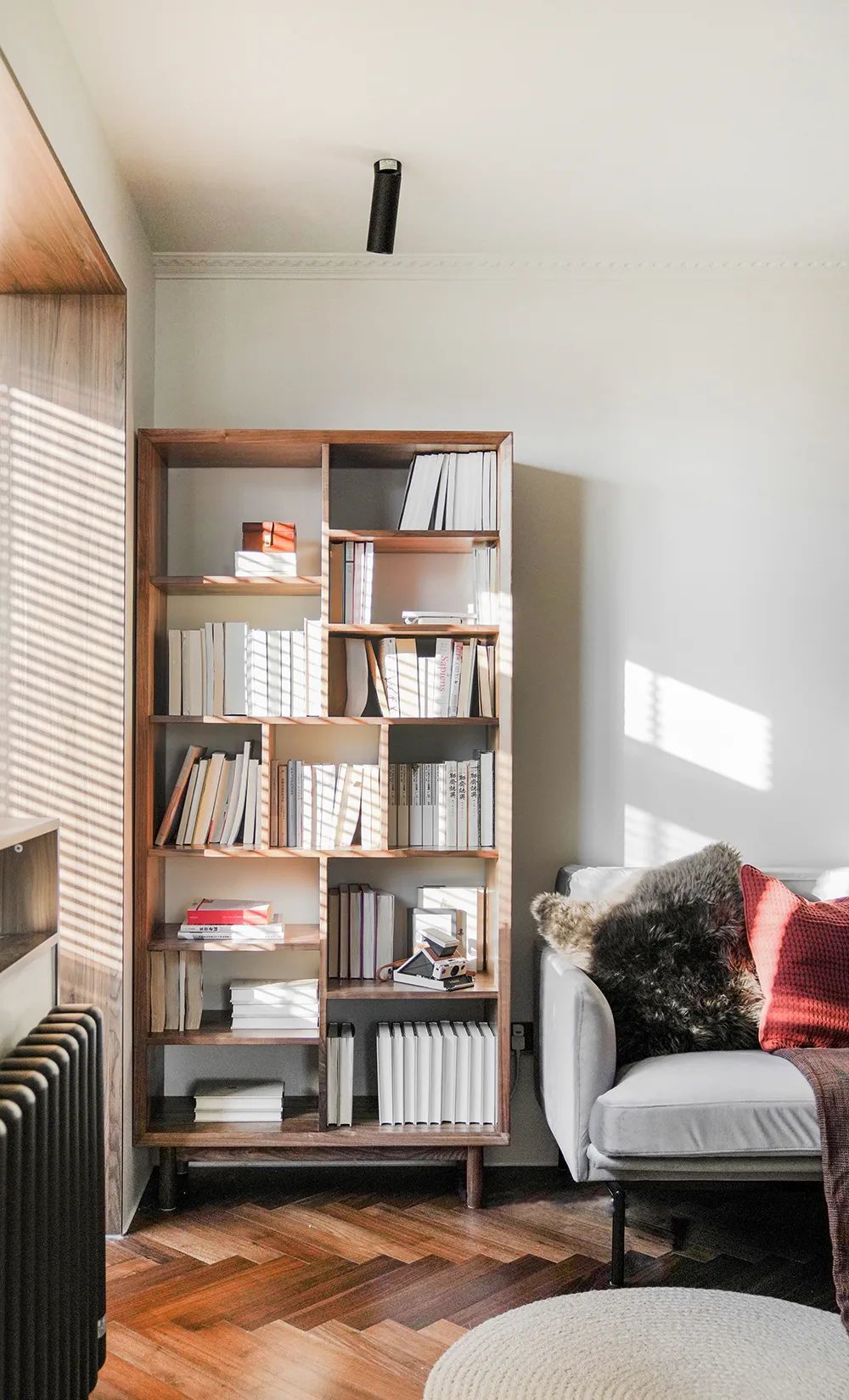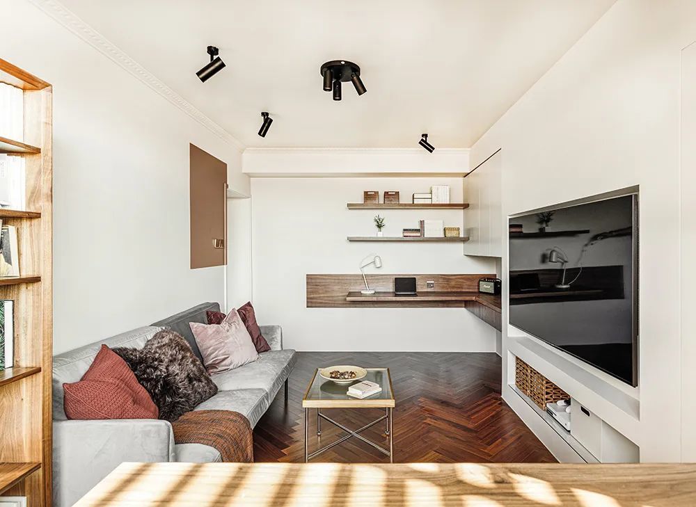 ○ 客厅新增办公区,利用柜体进行一定程度的融合,视觉上更整体;