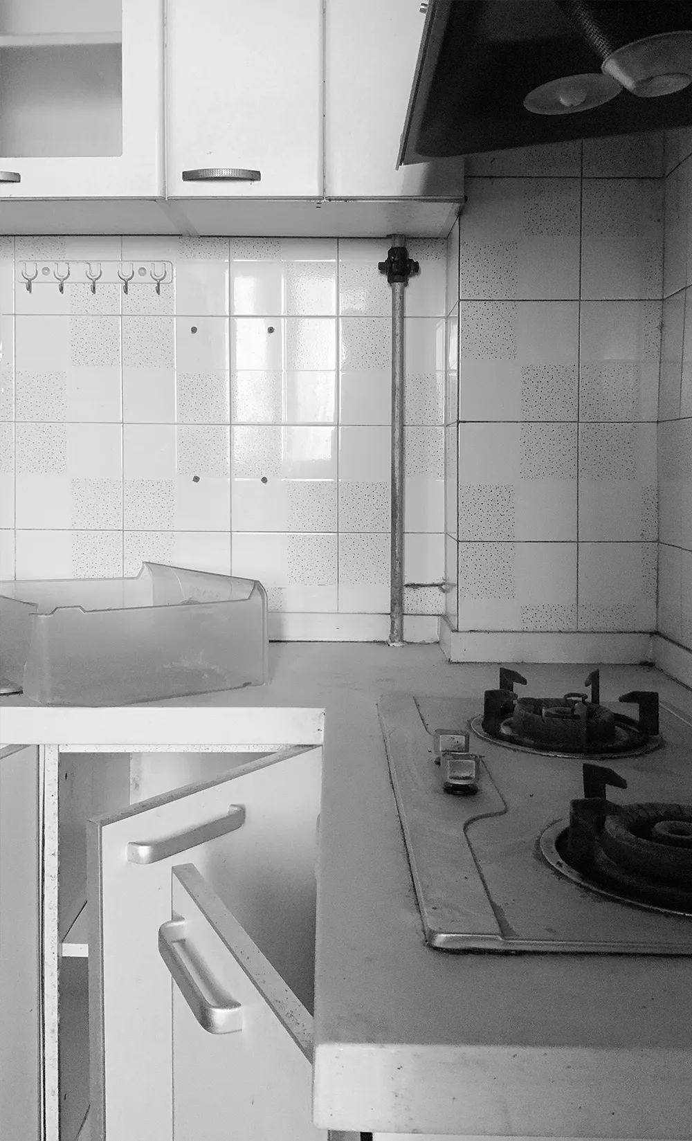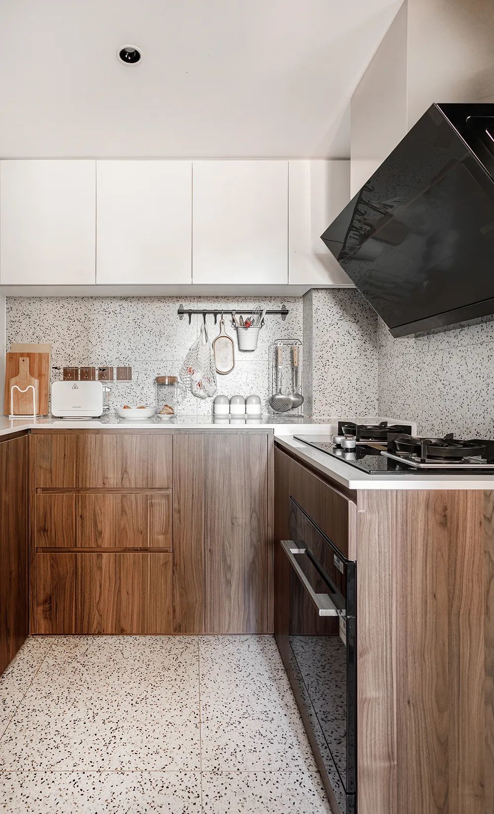 厨房U字型布局紧凑便利,延续了主空间的配上元素,地面水磨石瓷砖一直延伸至墙面,为老旧小厨房减龄。