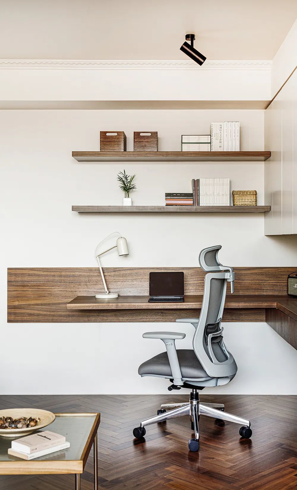 客厅角落区域的转角空间,利用隔板设置悬空桌面新增办公区,办公区利用吊柜与电视墙衔接,视觉上保证了空间的整体性。