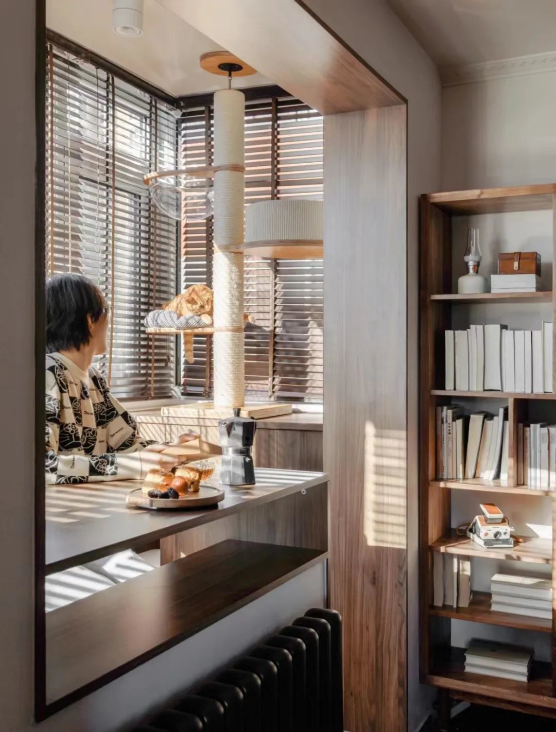 屋主家养猫,考虑到猫咪爱晒太阳的习性,猫爬架也设置在阳台光照最充足的区域,午后阳光好时,喝咖啡逗猫,猫咖即视感有没有。
