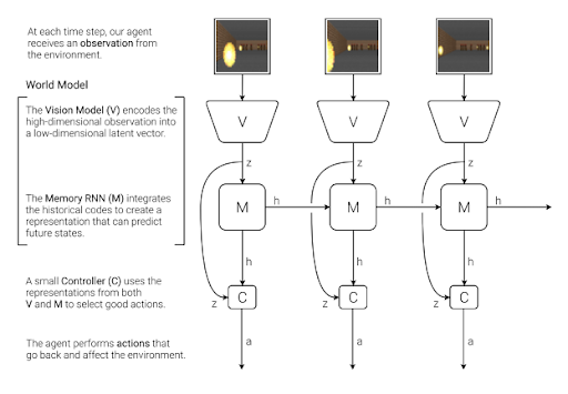 他们的框架结合了变分自动编码器 (VAE) 将视觉效果压缩为基本抽象,循环神经网络 (RNN) 预测这些抽象可能会如何随时间变化,以及控制器来决定最佳动作。