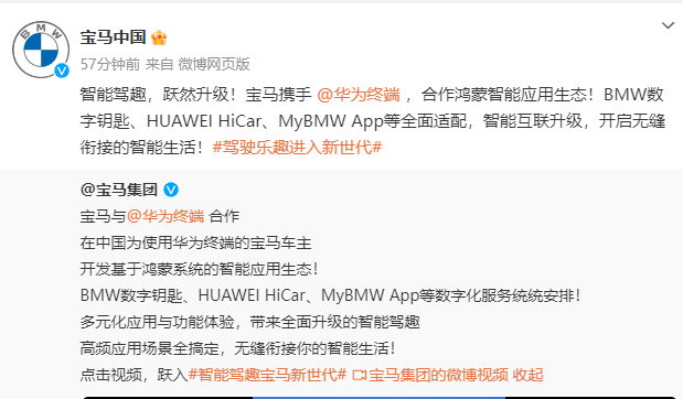 红星资本局3月17日消息,宝马集团今日在官方微博发文表示,宝马中国与华为终端达成合作协议。宝马在中国深度融合鸿蒙生态,推出包括BMW数字钥匙、HUAWEI HiCar和MyBMW App在内的数字化服务。